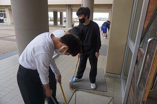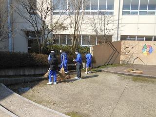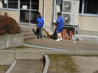 昨日に続いて、今日も天候が良く、校内リフレッシュ活動に協力してくれる3年生は校内の整備とともに、玄関前の中庭やステージ周辺の掃き掃除もしてくれました。