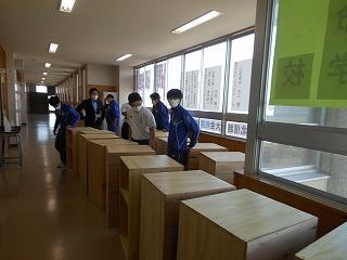 3年生が3学期に卒業制作として取り組んで各学級のBOXが完成しました。これまでは大変小さなものでしたが、この大きさになると生活ノート「はばたき」のカゴもすっきり入ります。3年生全員で制作してくれたものですが、代表生徒に永井校長先生からお礼の言葉がありました。