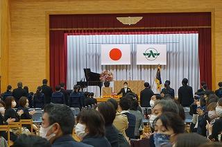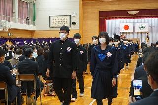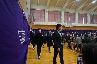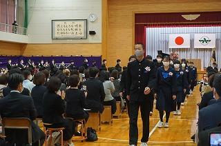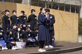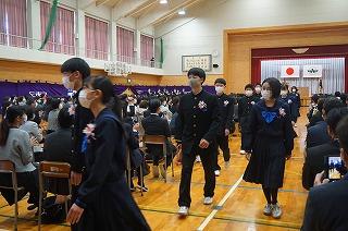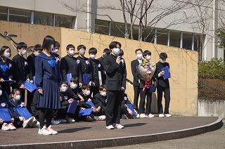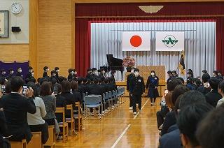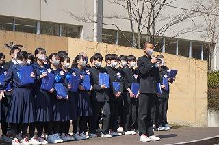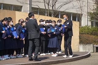 午前9時30分より、津幡町教育委員会教育委員の山本祝男様、越村崇様と本校PTA会長の森博幸様をご来賓としてお迎えし、第23回卒業証書授与式を開催しました。3年生167名と保護者2名以内の参加と規模を縮小し、式次第も割愛しましたが、卒業証書は永井校長先生から卒業生一人ひとりに授与しました。在校生代表の送辞は2年生の青木日葵さんが述べ、答辞は3年5組の上村優依さんが3年間の思い出を振り返りながら見事に務めました。90分の式を終えた卒業生は各クラスで学級担任の先生と別れ、学校中庭のステージで記念写真をとり、巣立ちました。