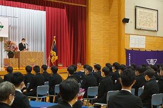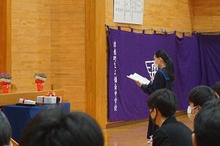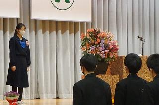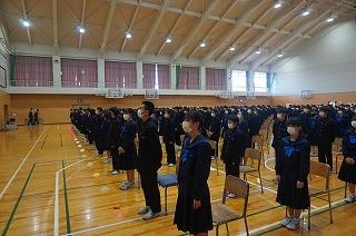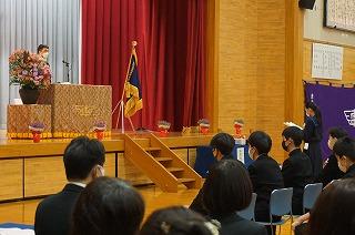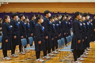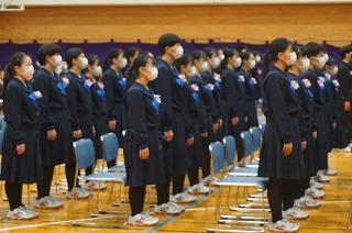 給食をはさんだ午後に、令和3年度離任式を行いました。昼休み後の予鈴で離任・退任する先生方を知り、びっくりした生徒もいましたが、気持ちを切り替えて、厳粛な雰囲気で式に臨みました。先生方のお言葉に続いて、生徒代表の林玲旺くんがお別れの言葉を述べ、久しぶりの校歌斉唱と大きな拍手で7名の先生方をお送りしました。