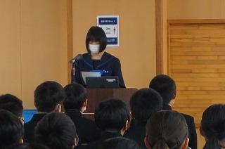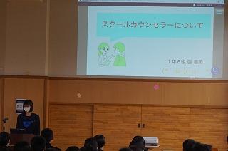 1年生は昨日1・2限に卓球場で学年集会を行いました。1限目は3学期に総合的な学習の時間で取り組んだ職業調べの学年発表会です。各クラスの代表生徒12人が図書館司書や獣医、歯科医師など、各自がまとめたスライドをChromebookで発表しました。