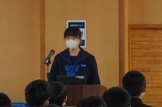 今日の5限目に、体育館で令和4年度前期生徒会役員選挙立候補者立会演説会を行いました。選挙管理委員会の山田健太君が挨拶した後、立候補者の演説に入りました。どの候補者も堂々と自分の主張を述べていました。卒業した3年生を意識し、来年度の津幡南中学校をリードしていく決意が感じられました。