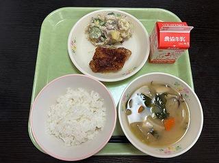 河北潟ポークを使った美味だれ、かほっくりを使ったサラダ、河北潟の小松菜が入ったみそ汁でした。