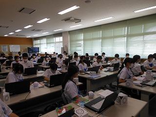 1年生の夏休みの宿題に家庭科の「オリジナルお弁当」作りがあります。新型コロナ禍により調理実習を控えているため、各家庭でお弁当を作り、8月30日の始業式の日に持ってくるという活動です。生徒たちはChromebookや教科書の栄養素表を見ながら、どんなメニューにするか、レイアウトも工夫しています。