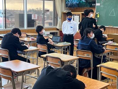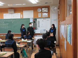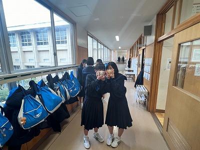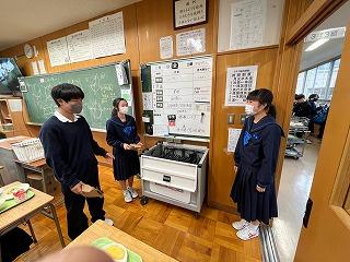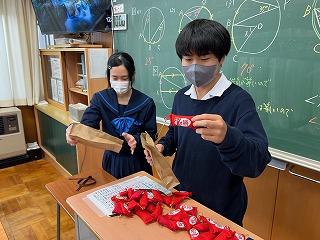 本日給食時、家庭部員が3年生へ合格祈願のお守りを手渡しました。