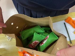 「何らかの形で受験に向かう3年生を応援できないか」と家庭部員で考え、3年生全員に向けてお守りを手渡すことに決めました。学校祭が終わってから、」運動会の団の色に合わせたお守りの制作を始めました。