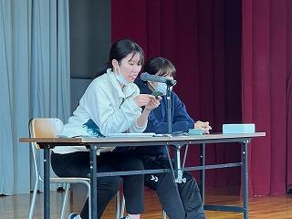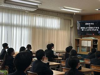 総会では、日頃の自分の様子を振り返り、授業中の姿勢や態度、また、生活について時間を守れているかなどのアンケート結果が示され、その結果に対してどう改善していくかが生徒会から意見が述べられました。