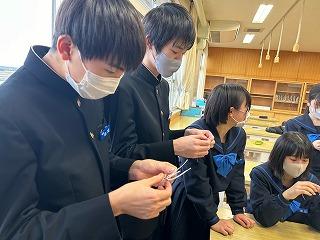 美術の時間、3年生は、卒業式で先生方が胸につけるコサージュを作っています。