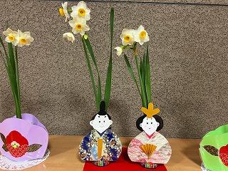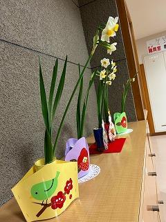 職員玄関には、ひな祭りの花立てが飾られ、来校者を迎えています。