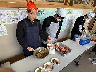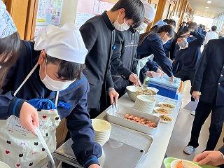 給食準備は、10分以内に完了するという目標で、当番の生徒たちは準備を急ぎます。