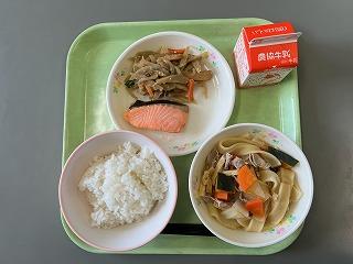 ごはん、鮭の塩麹焼き、金平ごぼう、ほうとうです。