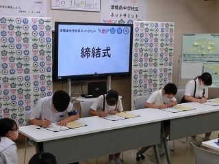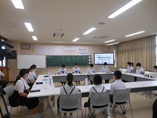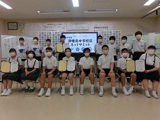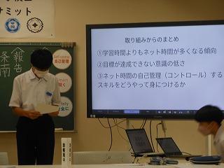 今日9時より、1階会議室で「南中校区ネットサミット」を行いました。中学校から生徒会執行部の7名と生活委員長の首田くん、3小学校から計画委員会や企画運営委員会の皆さん計8名が参加しました。まずは4校からネットやメディアに関する1学期の取組とその取組を受けての課題を報告しました。その後、グループ協議を行い、小中学校で2学期に取り組めることについて意見を出し合いました。その結果「一人ひとりのより良いネット利用のために、スケジュールを作成し、全員で協力して取り組む」を大目標に、具体的な取組を進めることが決まりました。