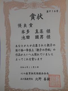 石川県よい歯の学校選彰で表彰状をいただきました