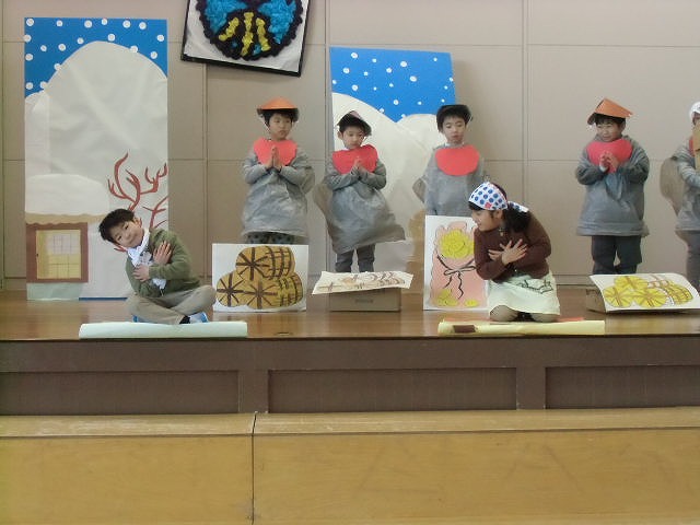 年長さんを迎える会を終えてから2週間足らずの練習でしたが、みんなよくがんばって、セリフや動作や歌を覚えたり、小道具もみんなで準備したりしました。明日は、大勢の人の前でのはじめての演技ですが、がんばってほしいと思います。