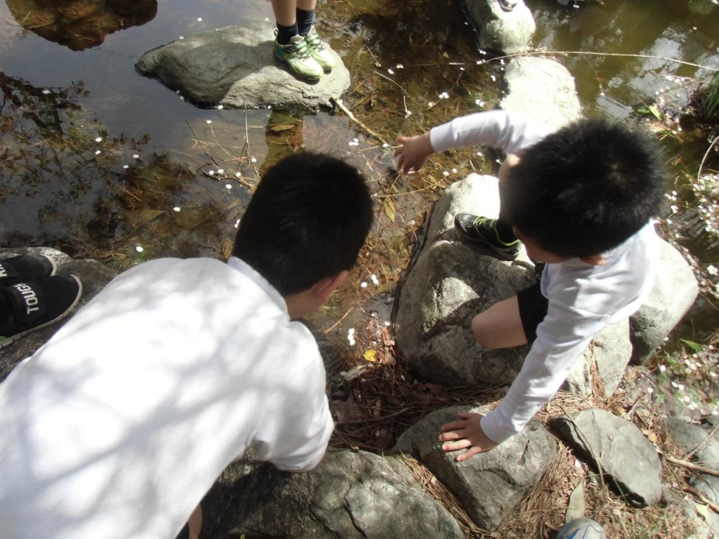 学校の前庭の池には、おたまじゃくしが泳いでいました。たくさんの木々も芽吹き、子どもたちは、かわいらしい草花をたくさんみつけていました。見つけた発見は、絵と文にして教室に掲示しました。