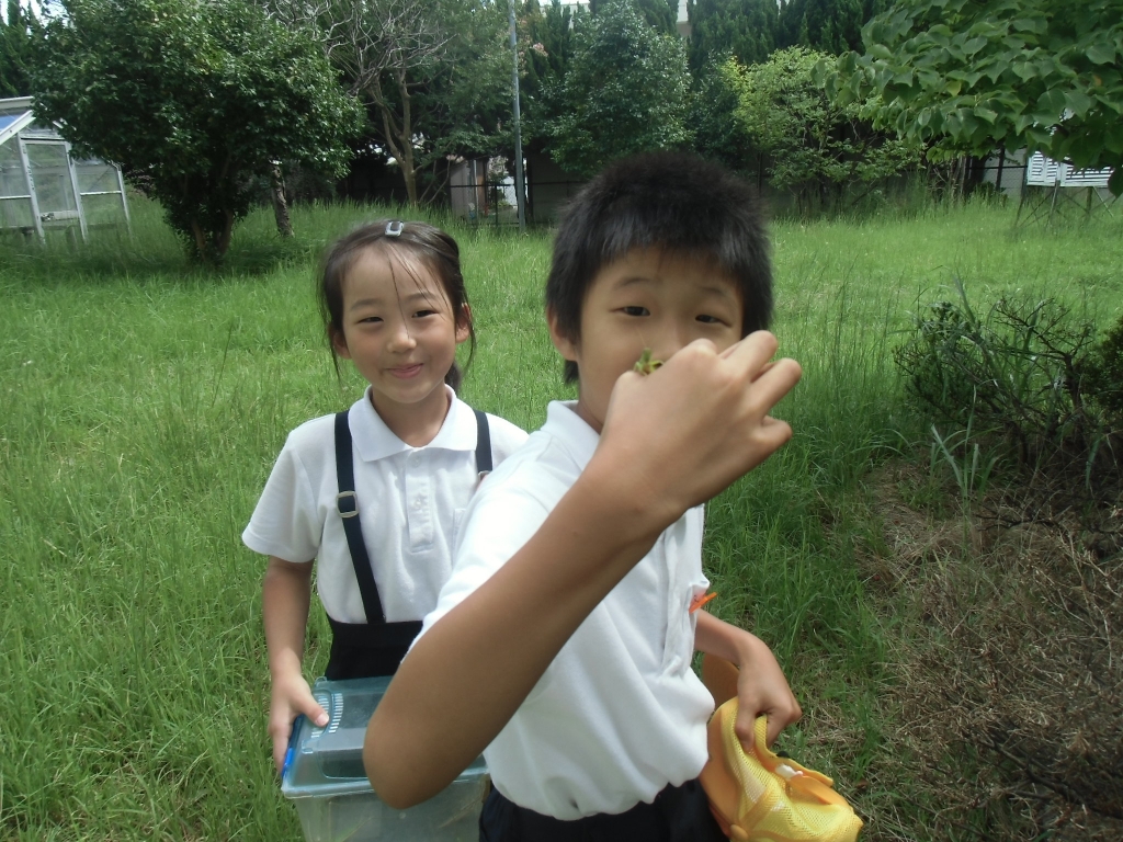 草原では、ばったやいなご、カミキリムシ、かまきり、こおろぎ、ちょうちょなどをみつけて、大喜びのこどもたちでした。一番人気は、かまきりで、かまきりを見つけようと一生懸命になっていました。暑くても元気いっぱいの2年生です。教室に戻ってから、生き物にとって過ごしやすくするためには、どんなすみかがいいかを話し合いました。