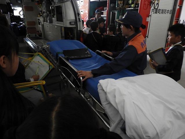 消防署では、消防車や救急車の設備を実際に見せてもらったり、