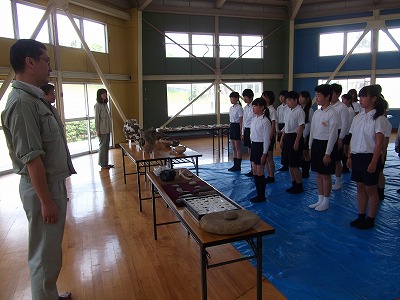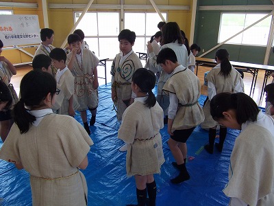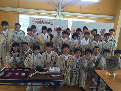 埋蔵文化財センターから3名の先生方をお招きして「出前考古学教室」が行われました。縄文時代の学習を終えたばかりの子供たちにとっては、すべての体験が興味深く感じられたようでした。縄文時代の生活に関する説明を聞いた後、当時の衣装に着替え、いよいよ体験スタート!!