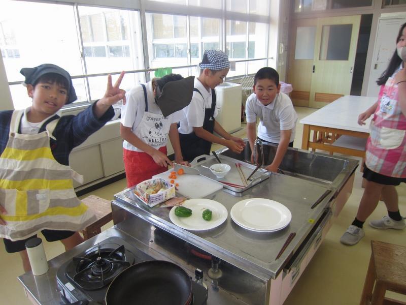 班のみんなと協力しながら一生懸命作っていました。包丁で食材を切ることや火を使って調理することは、この先きっと生活する中で役に立つことと思います。そして、作ったものをすべて残さずきれいに食べる姿が素敵でした。また、後片付けまでみんなで協力している様子もさすが高学年!