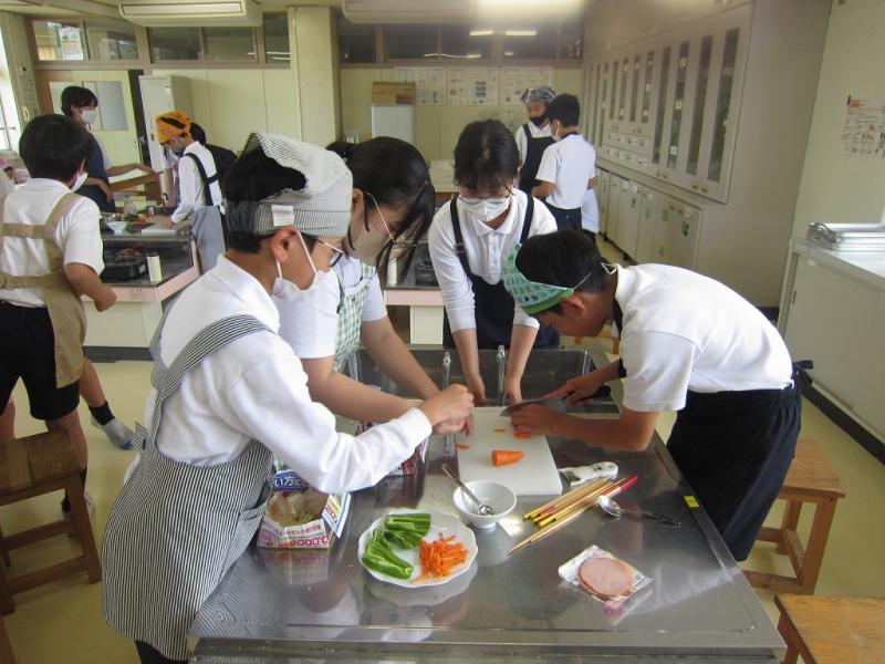 家庭科で、いためる料理を作る学習をしました。にんじん、ピーマン、玉ねぎ、ハムを使った「いろどりいため」です。