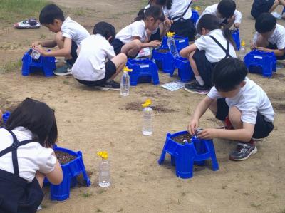 生活科の時間にあさがおのタネを植えました。1限目に植え方の勉強をして2限目に校庭で自分の鉢にタネを植えました。