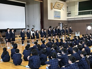 今日は全校集会と併せて、パトロール隊の方との対面式と、