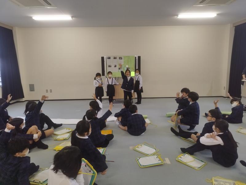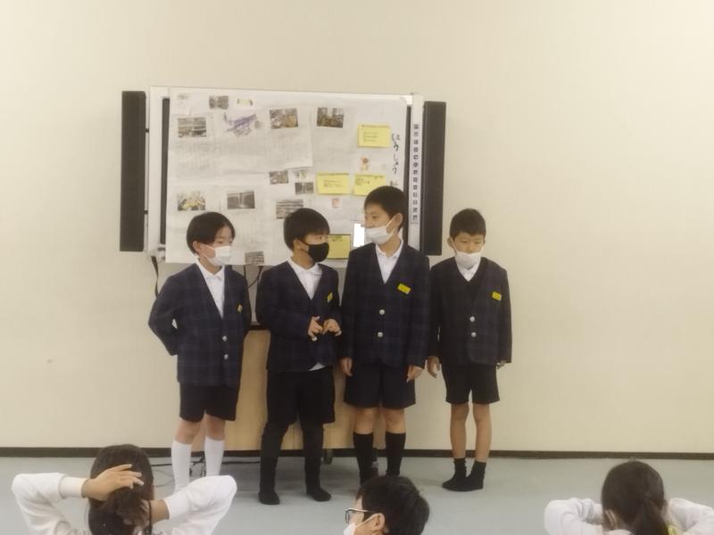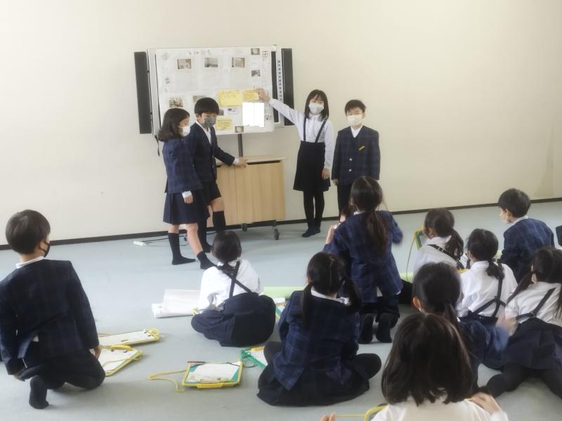 この日は2年生1,2組が集まり、これまでまとめた新聞の内容を紹介する発表会を行いました。子どもたちは、他のグループの発表を聞きながら、良いところをメモしていました。子どもたちはとてもよく話を聞き、クイズの場面では「〇〇〇〇じゃない?」「さっき(記事の紹介で)言っとったよ。」などと発言していました。今回の町探検は3つの場所に分かれて行ったため、発表会で初めて知ったことも多くあったようでした。