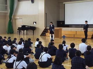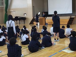 後半は児童集会です。今回は後期委員会委員長の任命式と1年生による歌の発表でした。