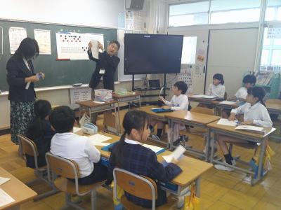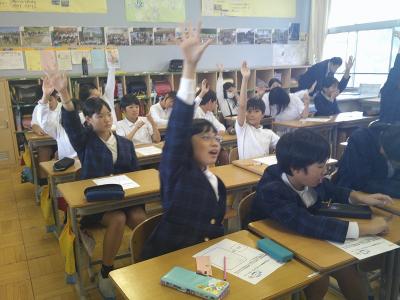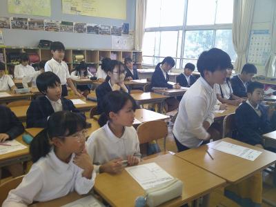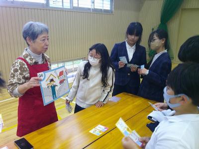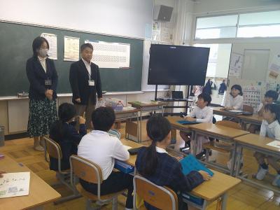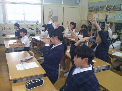 5年生が理科「台風と天気」の学習の一環として、もしもに備える防災学習をしました。講師は石川県防災人材アドバイザーの青海万里子さんです。