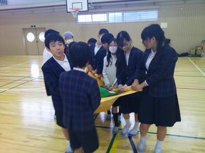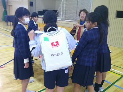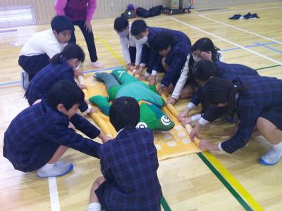 「家にあるものがどのような場面で役に立つか」「家庭に備えておくと役に立つ防災グッズ」「毛布をつかってけが人や病人を運ぶ方法」について学びました。カードゲームを通した話し合い、非常持ち出し袋を背負う体験、毛布を使って担架をつくる体験を行いました。