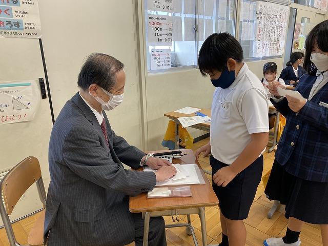 4年生 交流教室と点字教室 投稿日時 : 2022/11/28 教職員 4年生は総合的な学習の時間、福祉について学習しています。11月25日(金)、目の不自由な方との交流教室と点字教室を行いました。交流教室では、目の不自由な方の苦労や生活の工夫などを聞き、たくさんのことを学ぶことができました。長いお話をする時には、点字の原稿を使いながらお話をするそうです。点字教室では、点字の仕組みや打ち方を学び、自分の名前を点字で打ってみる活動をしました。自分の打った点字を、実際に目の不自由な方に読んでもらい、嬉しそうな表情を浮かべていた子ども達です。 Tweet