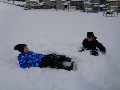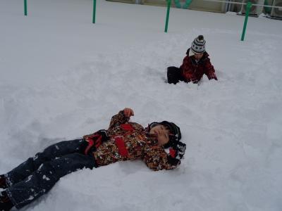 雪の中で寝転がって、いつもとは違う感覚を楽しんでいるようでした。