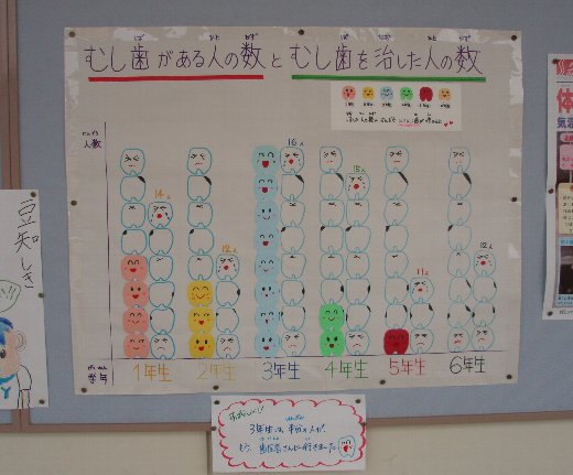 学年ごとに鶴ケ丘小のむし歯の様子がわかりやすくはりだされています。