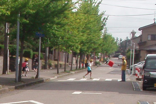 その中で鶴ケ丘安全パトロール隊が毎朝・毎下校時に通学路の各交差点に立って下さり子どもたちの安全を見守って下さっています。鶴ケ丘の町会は碁盤の目状で見通しが良く、写真のように1km先までパトロール隊が辻々に安全指導をして下さっている姿を見ることができます。
