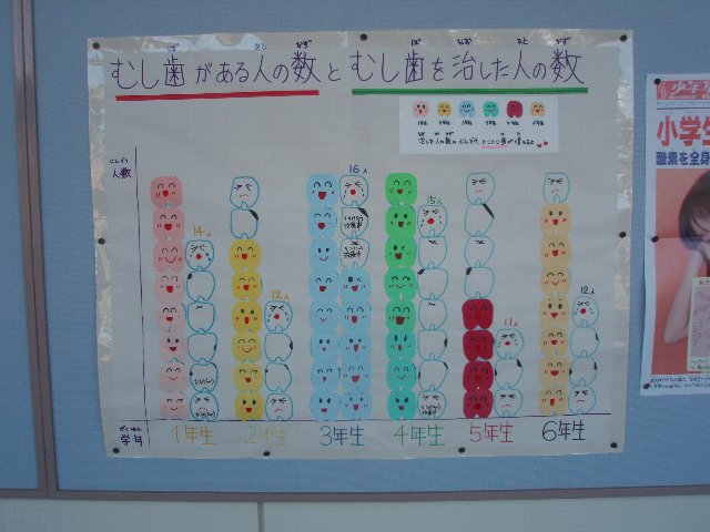 保健室前、夏休みの間にむし歯の治療が進みました。全員治療した学級も!