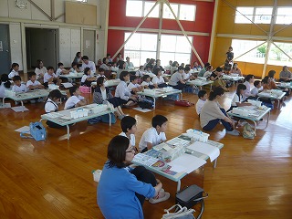 いつも元気な声が響いている鶴ケ丘小の体育館が、今日はすてきな美術館になりました。