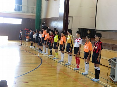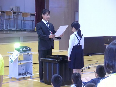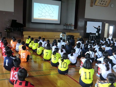 今日の全校集会では、はじめに、町のサッカー交歓会に出場する6年生を激励する壮行式が行われました。