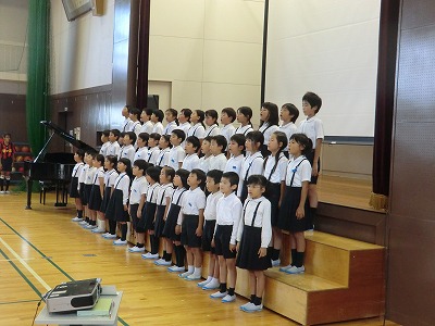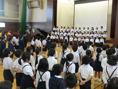 最後に、3年生の今月の歌の発表、全校合唱が行われました。鶴ケ丘小の伸びやかな歌声が体育館に響きました。