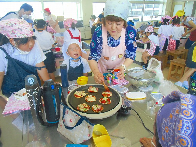 子どもたちが、自分で野菜を洗ったり切ったりして調理をしました。自分たちで育てた野菜を使って自分たちで作ったミニピザは、格別の味だったようです。みんな、夏をおいしく頂きました。ボランテイアに来てくださったお家の方々、ありがとうございました。