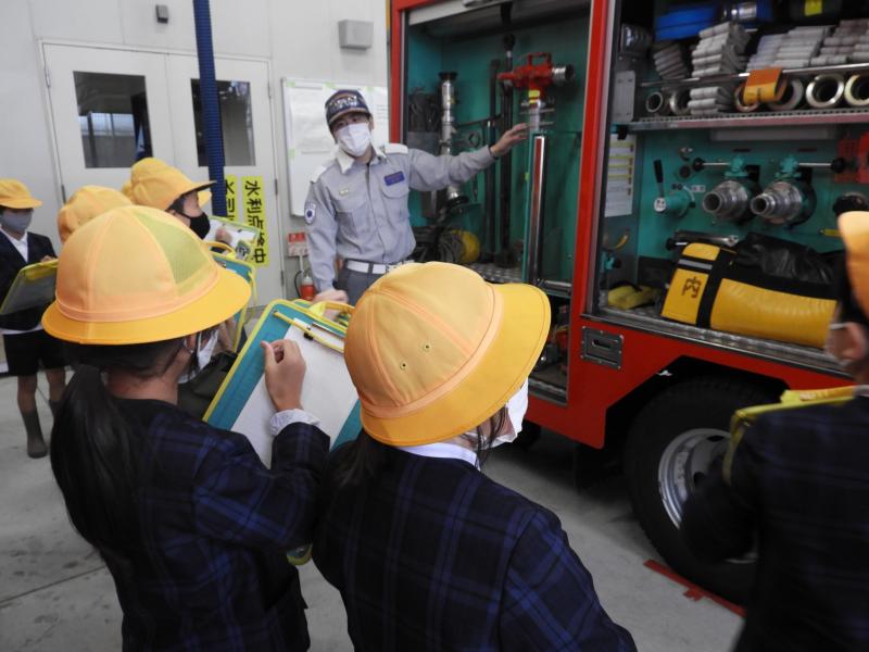 子どもたちは、消防署内の施設や消防車や救急車の設備の説明をとても真剣に聞いていました。私たちのくらしを守るため、日夜働いてくれている消防士の方達の仕事の工夫をたくさん知ることができました。