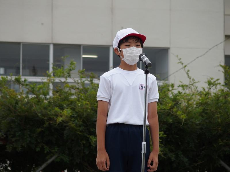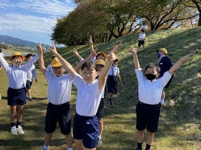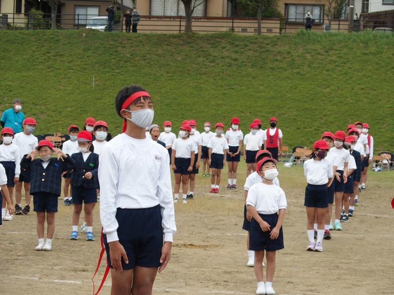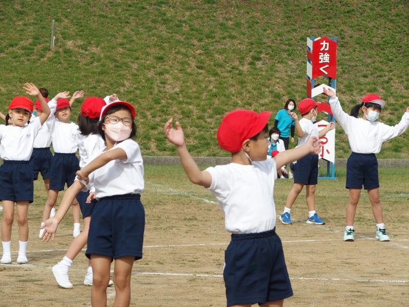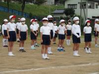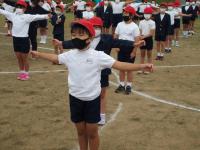 準備体操では、ラジオ体操のお手本を示してくれた5、6年生をしっかり見て、大きな動きで体操をしました。