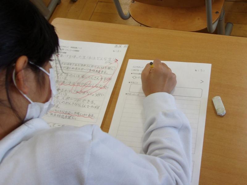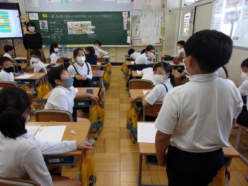 4年生は総合的な学習の時間に福祉に焦点を当てて学習を進めています。障害のある人や障害のある人をサポートしている人との出会いを通して、障害のある人の思いや願いを理解して、自分たちの町がだれにとっても暮らしやすい町になるように自分たちができることはないかを考えていく学習です。この日は、車いすを使って生活する人達がもっと暮らしやすくなるように自分はどんなことができるかを考えました。