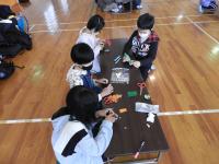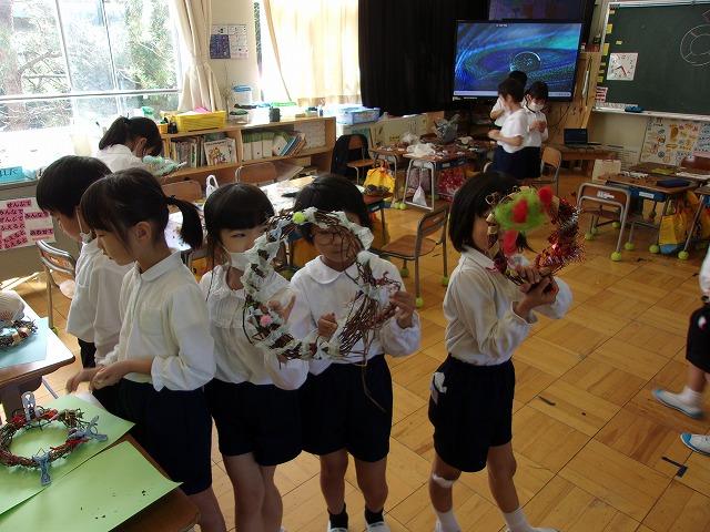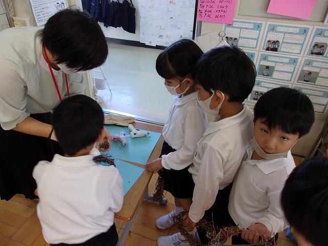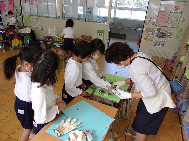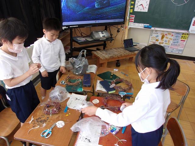 春から夏にかけて育て、観察してきたあさがお。その種を収穫した後は、つるを使ってリースづくりをしていきます。この日は、丸く束ねたあさがおのつるにまつぼっくりやどんぐり、色とりどりのリボンで飾り付けをしていました。1年生の教室に入っていくと、「校長先生、見てください」と自分で作ったリースを得意げに見せてくれる子もいました。自分で使うと危険な道具は先生が手伝いますが、はさみやのりなどをうまく使うことも学習の一つです。どんなリースができるのか楽しみですね。