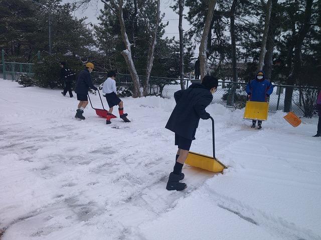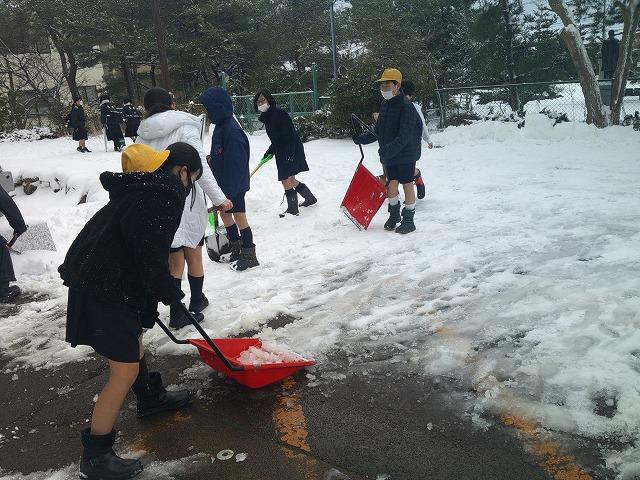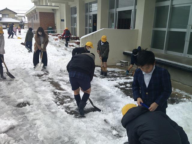 3学期のスタートは穏やかな日が続いていましたが、今週は寒波の影響で久しぶりに雪が積もりました。休校開けの26日(木)、登校してきた5,6年生は、進んで除雪用具を手に児童玄関前の駐車場を除雪してくれました。7時40分の開錠を待っている間も除雪してくれる児童がいて頼もしく感じました。おかげで児童玄関前がきれいになりました。ありがとう!!