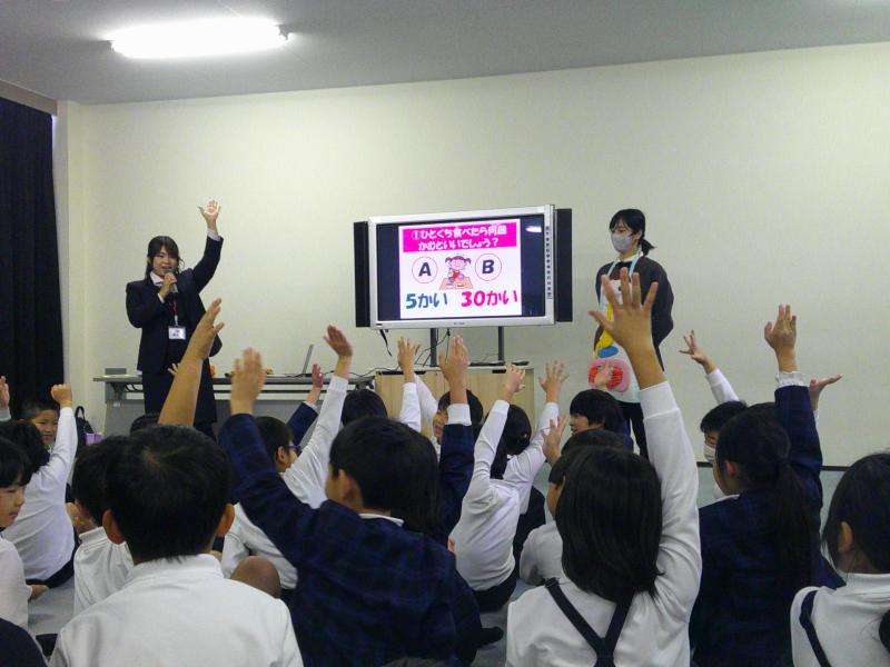 子どもたちはどの話にも興味津々で、クイズを交えながらの授業に楽しんで取り組んでいました。腸の長さや働き、腸の中にいる菌のことなど、初めて知ることも多かったようで、子どもたちからは驚きの声が聞こえてきました。