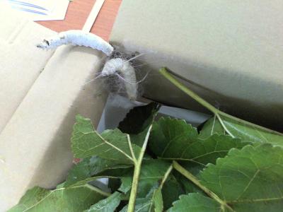中には、高いところに上る習性からか、飼育箱の外側で繭を作ろうと試みる蚕も数頭見つかりました。