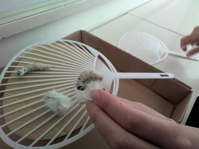 蚕たちは、うちわの上で再び懸命に糸を吐き、本来うちわの「紙」である部分を