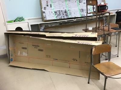 6000匹の蚕の成長に合わせ、寝床も大きくなっていきます。ダンボールで一畳半ほどの寝床を6つ作りました。