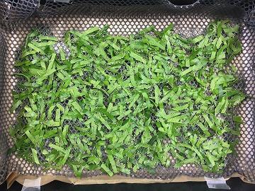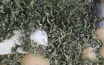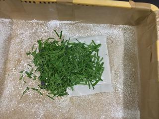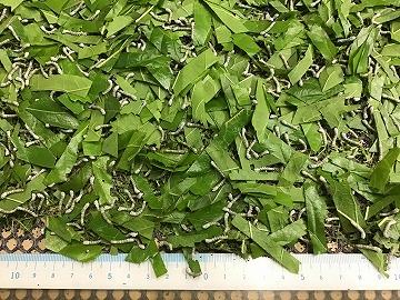 3令蚕は、桑の葉を噛む力も強くなっているので、切り桑は卒業し、ある程度の大きさに千切った桑の葉をまんべんなく、お蚕さんたちの上に敷いてあげます。