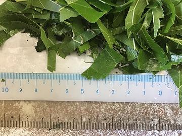 ちなみに、現在は一食につき約60枚の桑の葉を切って与えています。モリモリ大きくなって、現在の体長は12~15mmほどにまで成長しました。